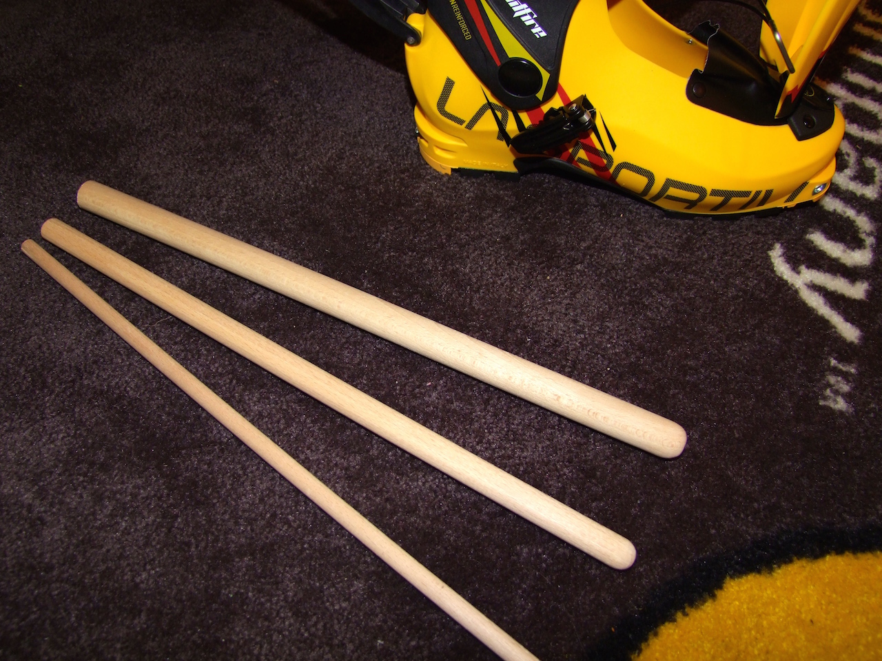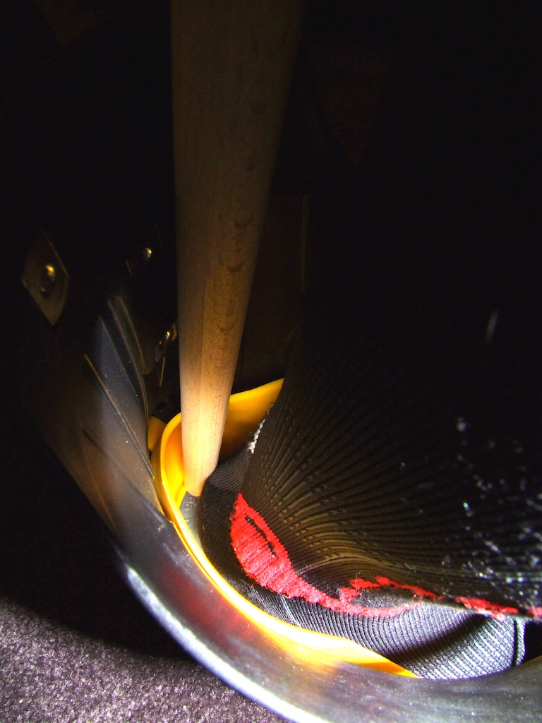 3. Debout, dans la coque nue (sans le chausson), contrôlez l’espace entre la coque et votre talon. En magasin, nous utilisons des gabarits en bois (voir photos ci-dessous). La taille du gabarit est fonction de votre profil de skieur (10mm = compétiteur, 15mm = expert, 20mm = polyvalent)