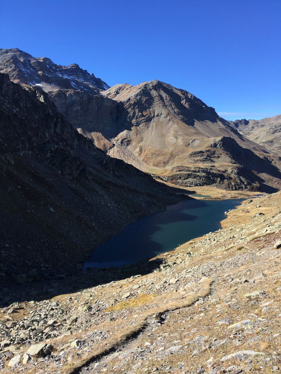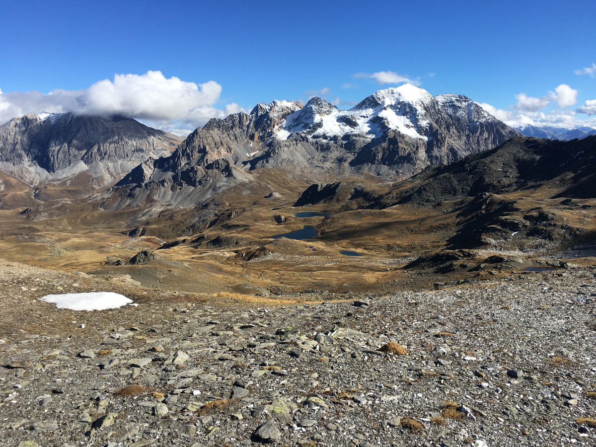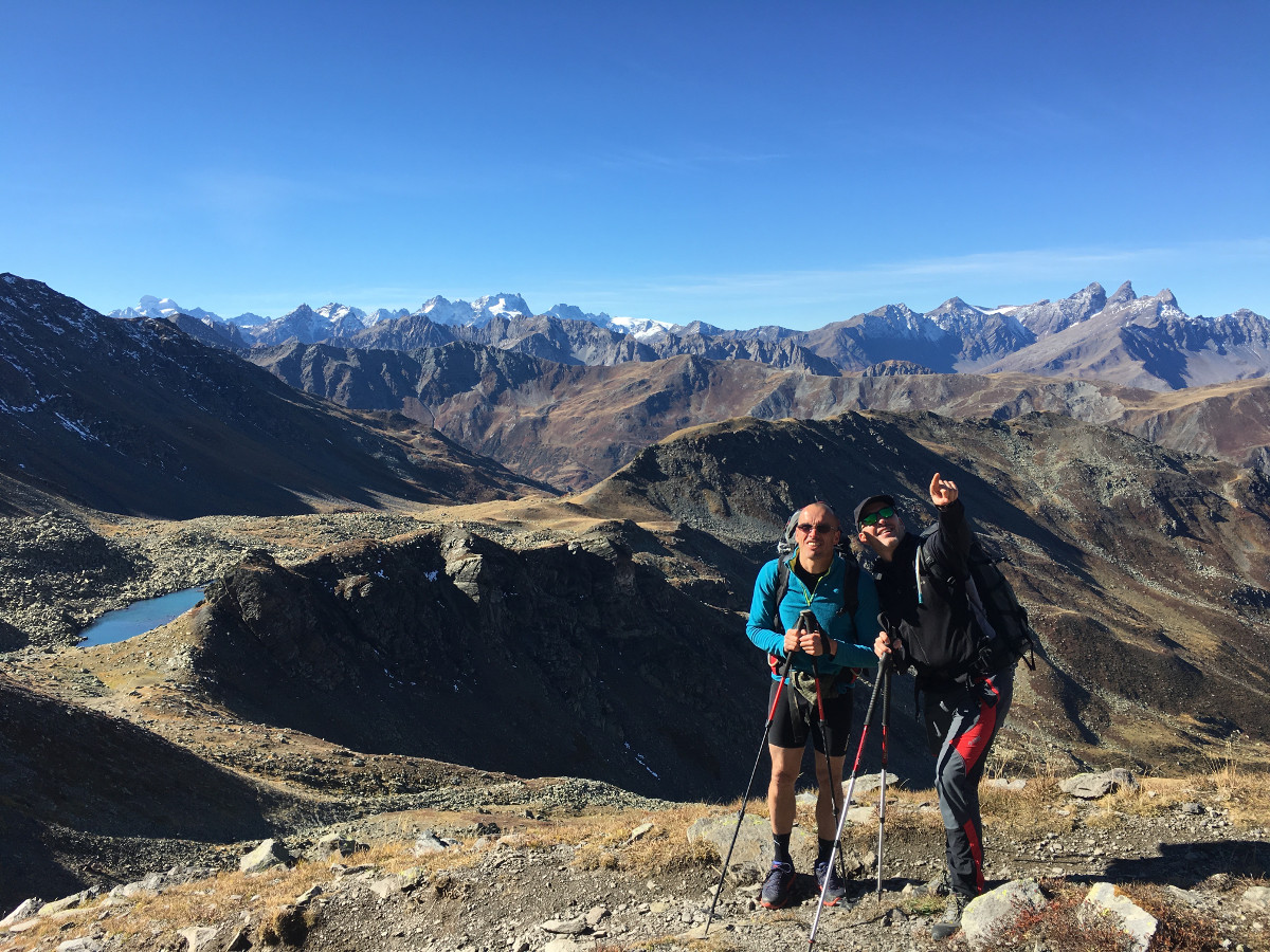 Vue sur les Ecrins, la Meije à gauche, le Rateau à droite… »Seuls au monde à la mi-octobre. C’est top ! Personne aujourd’hui sur tout le parcours ! La sensation d’un trekking à l’autre bout du monde à 1h15 de Chambéry ! »