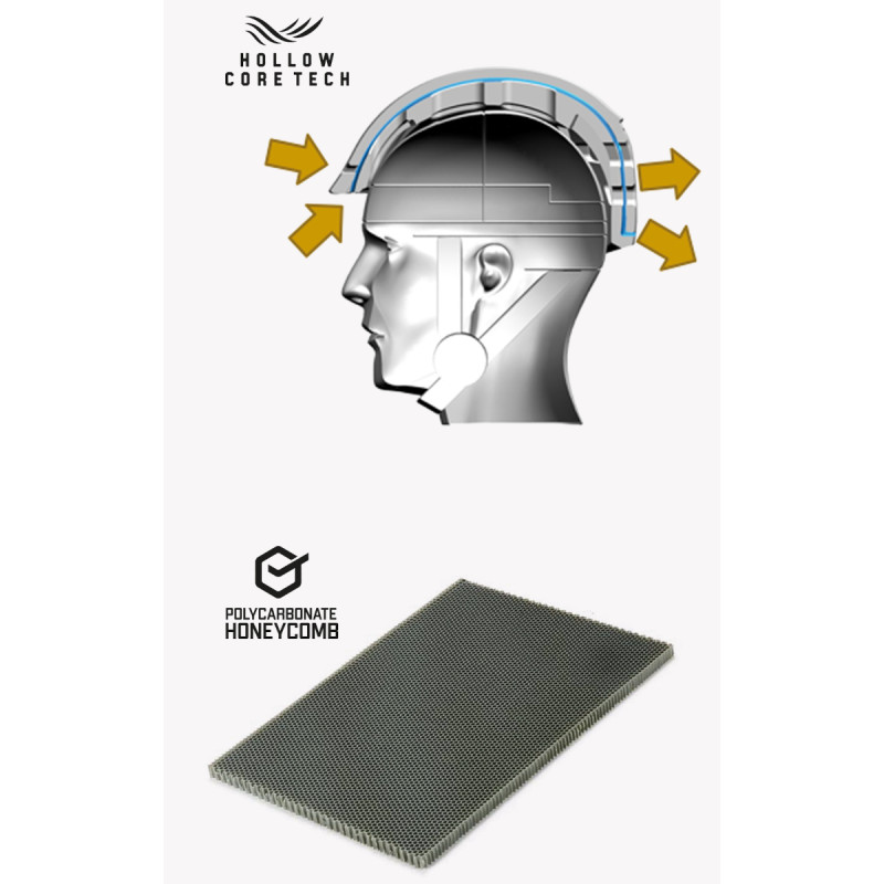 Technology HOLLOW CORE : 2 EPS (construction in-mould ) sont assemblés pour créer 6 canaux de ventilations dans la coque (voir schéma).