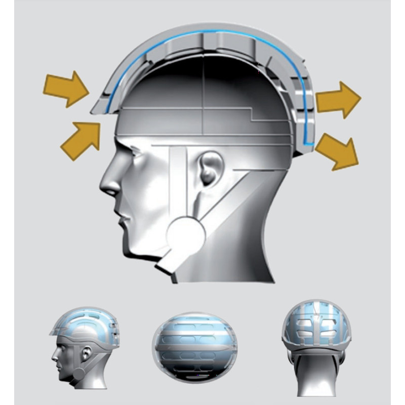 | Construction | Coque : Polycarbonate avec finition mat Intérieur : Haute densité de Polystyrène avec tampons en microfibres Technology HOLLOW CORE : 2 EPS (construction in-mould ) sont assemblés pour créer 6 canaux de ventilations dans la coque (voir schéma canaux bleus). |