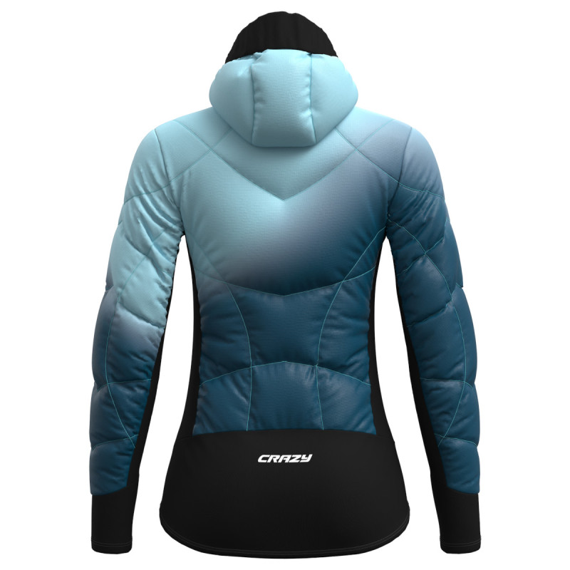 La veste d'isolation en duvet EXIT JACKET de Crazy est doudoune très technique femme, chaude et confortable utilisant un zonage avec des tissus Softshell résistants et respirant pour un usage actif.