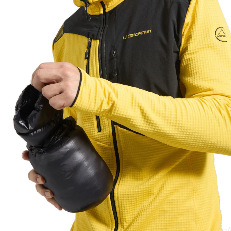 La veste d'isolation en duvet LUMINA 300 DOWN JACKET MEN La Sportiva est une doudoune à capuche homme haut de gamme avec un tissus Pertex Quantum "Diamond Fuse" fin, léger, très résistant et coupe-vent et un garnissage de 172g de pure duvet d'oie blanche de 1000 CUIN !