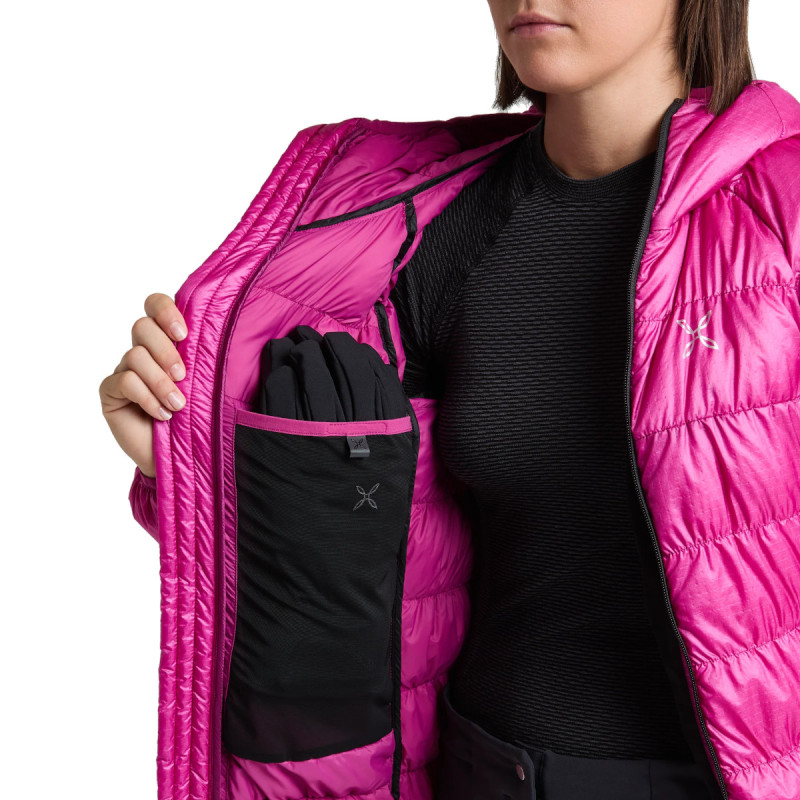 La doudoune à capuche VERTIGO DIAMOND DUVET WOMAN de MONTURA est une doudoune femme pour la Haute Montagne et l'Alpinisme où légèreté et rapidité de mouvement sont essentielles.
