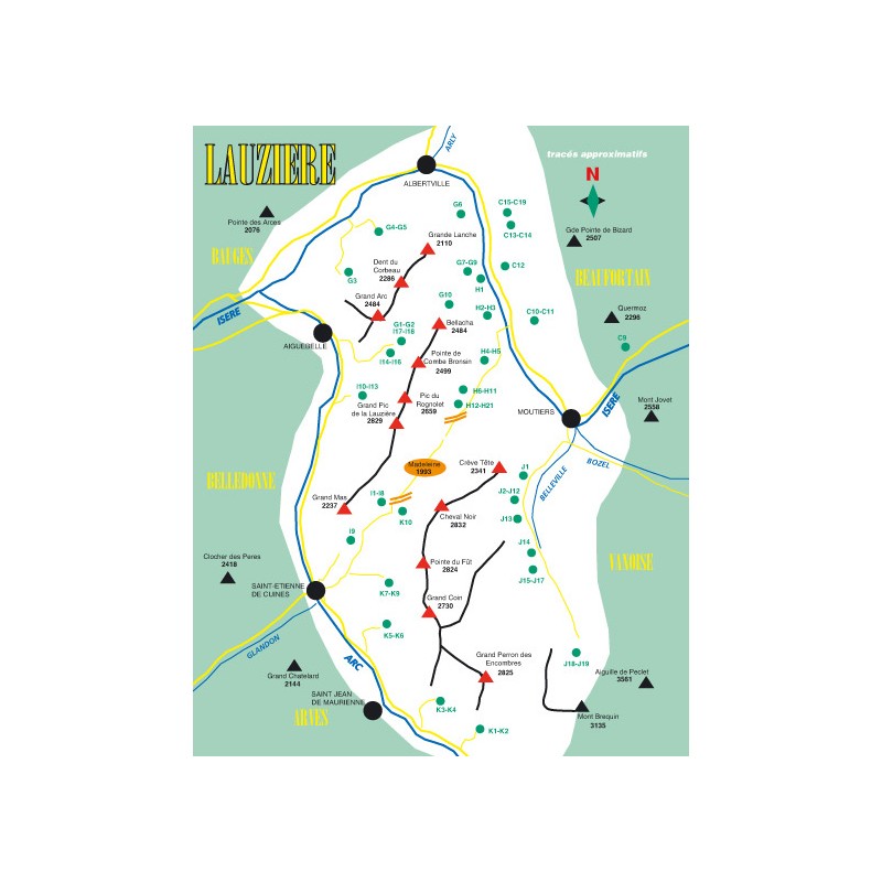 Principaux secteurs décrits : Terrasse, Roignais, Bizard, Mirantin, Grand Fond, Enclaves, Grand Arc, Lauzière Nord, Lauzière Sud, Encombres Nord, Encombres sud...