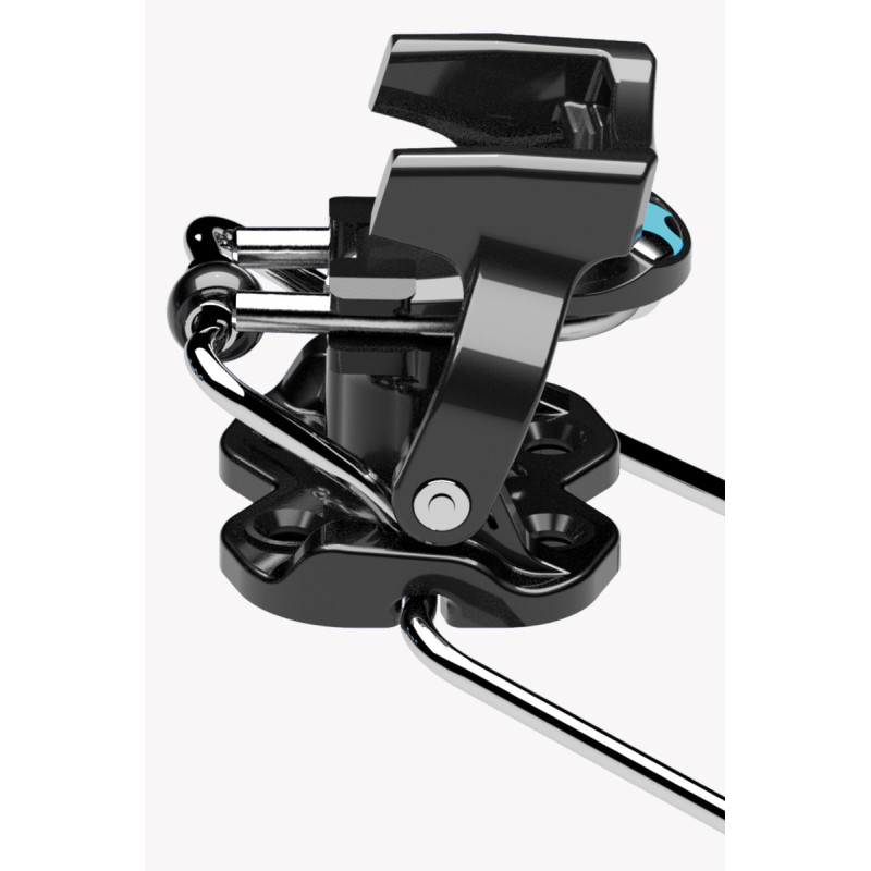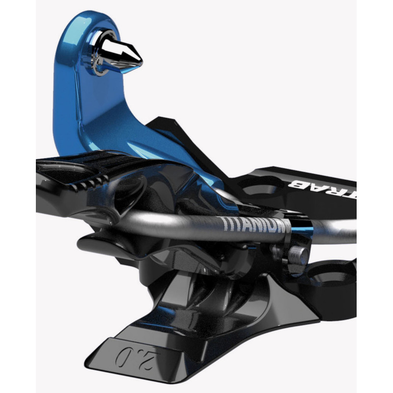 Sa spécificité : un levier élastique en titane à l'avant avec indépendance des ergots qui absorbe les variations de mouvement de la chaussure en descente ou en traversée de façon indépendante + une grande facilité de chaussage + cale de montée.