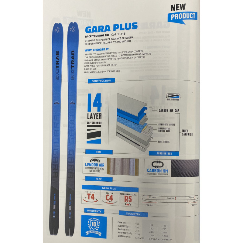 Ce ski de compétition en ski alpinisme Gara PLus de SkiTrab (qui remplace dans la gamme les Powercup et le Liraces des hivers précédents) est un super ski à la fois ultra léger (760g en 162cm) et durable.