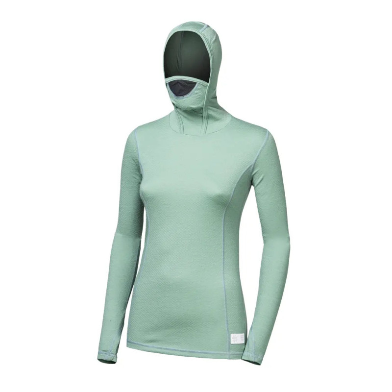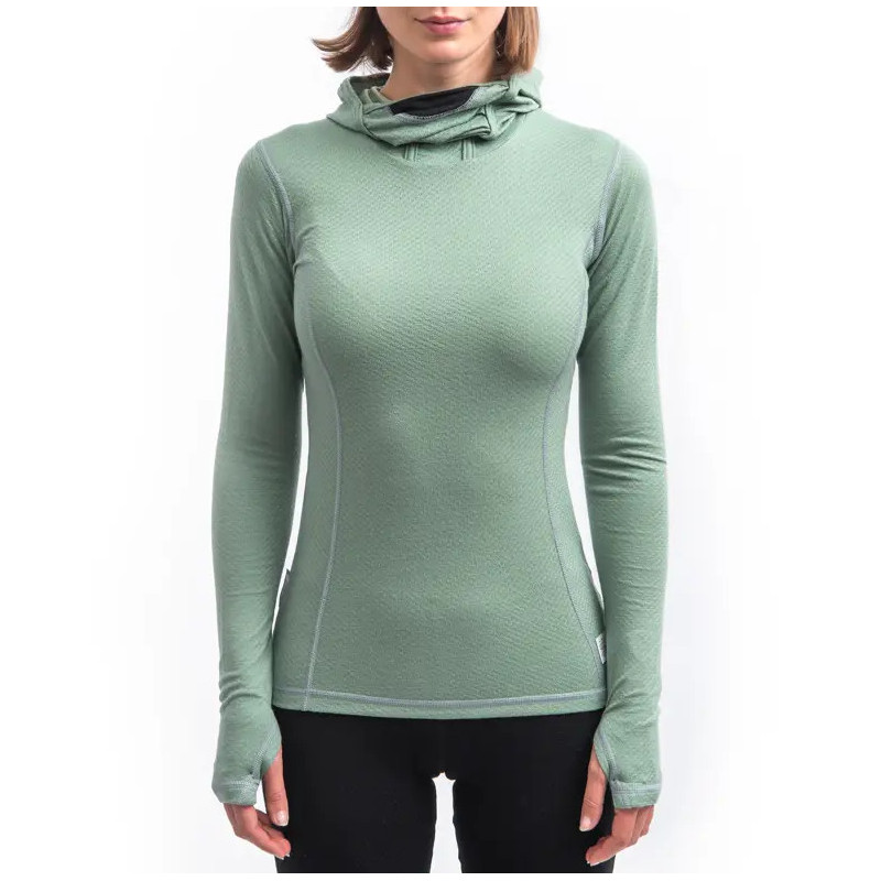 Tee-shirt manches longues femme, à capuche, double face (intérieur synthétique, extérieur en laine Mérinos de haute qualité), d'épaisseur moyenne (170g/m2), très résistant, très thermique, pour une utilisation par températures fraiches à froides.