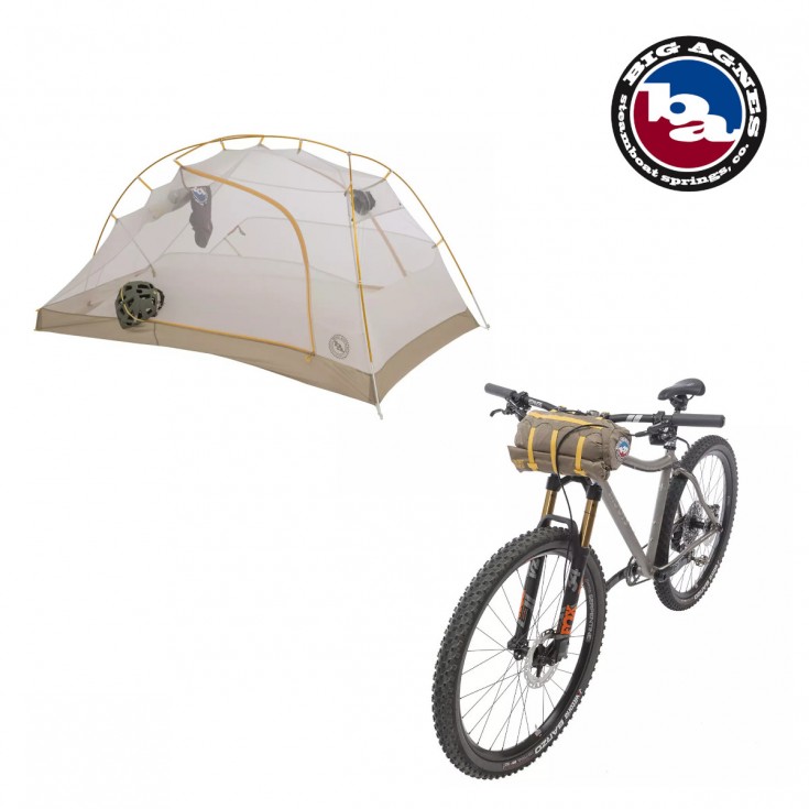La tente vélo bikepacking TIGER WALL UL 3 BIKEPACK "Solution Dye" BIG AGNES est une tente 3 places ( ou 2 grand confort), à 2 entrées, semi-auto-portée, compacte et légère (1500g), 2 saisons, avec tissus très fins en nylon ripstop SI+PU pour la bikepacking et le bivouac minimaliste où chaque gramme compte. Arceaux de 30cm de long pour entrer dans la housse de guidon imperméable spécialement conçue pour le montage sur vélo.