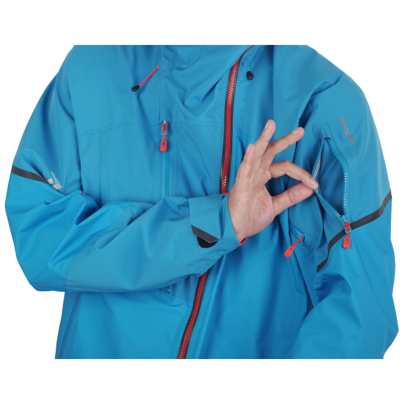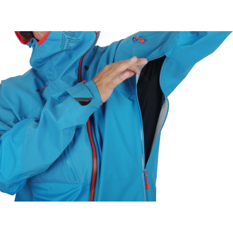 Lors de l'utilisation de la veste en ascension (charge aérobique élevée), il vous suffit d'ouvrir les fermetures à glissière latérales qui sont efficacement avancées à l'avant de la veste. Vous obtenez ainsi une ventilation exceptionnellement efficace. Les fermetures à glissière latérales vous permettent également d'accéder aux poches des couches inférieures chaudes de la polaire ou de la doudoune. Les manches anatomiques ont un revers renforcé pour une meilleure protection du poignet. Les manches sont munies de boucles pratiques pour fixer les gants de ski, gants d'alpinisme. La partie supérieure droite de la manche est équipée d'une poche supplémentaire facilement accessible avec réflecteur avalanche RECCO intégré, qui peut être retirée si nécessaire pour les activités estivales. Le bas inférieur de la veste utilise une forme ergonomique qui offre une protection accrue sur les reins et les fesses, tandis que la partie avant raccourcie présente une forme fonctionnelle pour l'utilisation d'un baudrier ou plus de liberté de mouvement pour les jambes en alpinisme.