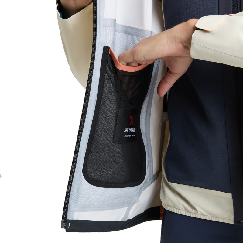 Membrane PROMETEO 3 couches à la fois parfaitement imperméable (20000mm) et respirante (25000g/m2/24h), avec grands zips de ventilation sous les bras. Son tissu améliore la gestion de l'humidité et la thermorégulation, vous gardant au sec et à l'aise dans des conditions changeantes. Elle est traitée avec Fresh Face, un déodorant spécial à base de plantes qui réduit efficacement les odeurs, permettant de la porter plus longtemps entre les lavages.