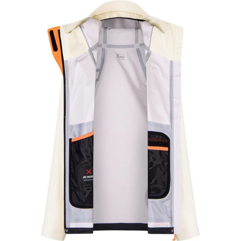 Membrane PROMETEO 3 couches à la fois parfaitement imperméable (20000mm) et respirante (25000g/m2/24h), avec grands zips de ventilation sous les bras. Son tissu améliore la gestion de l'humidité et la thermorégulation, vous gardant au sec et à l'aise dans des conditions changeantes. Elle est traitée avec Fresh Face, un déodorant spécial à base de plantes qui réduit efficacement les odeurs, permettant de la porter plus longtemps entre les lavages.